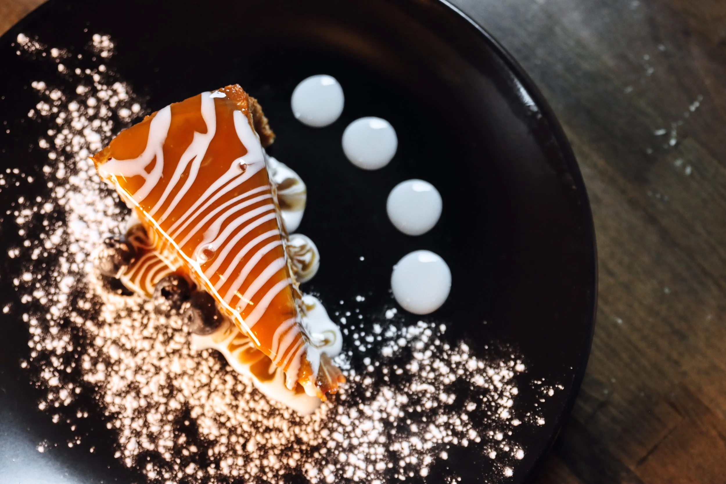 velvety cheesecake filing marbled with a dulce de leche. a buttery graham cracker crust, drizzled with salted caramel sauce