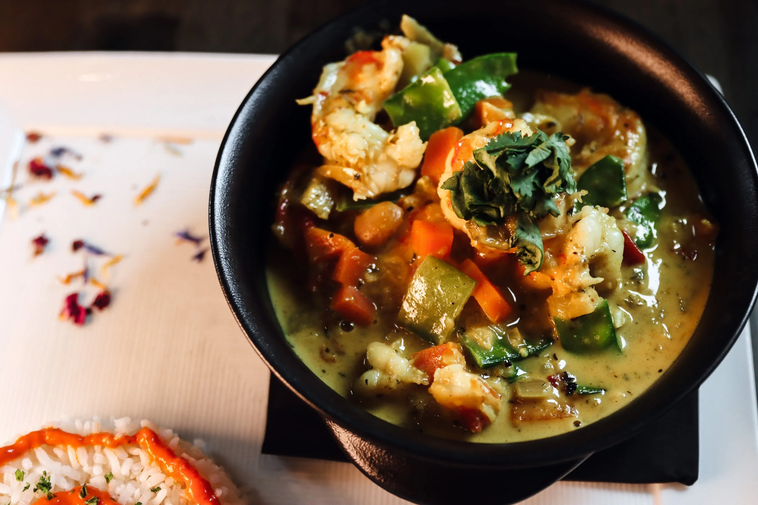 wild caught patagonia red shrimp in house yellow curry with cashews, plantains, pineapples and snow peas topped with cilantro; served with jasmine rice