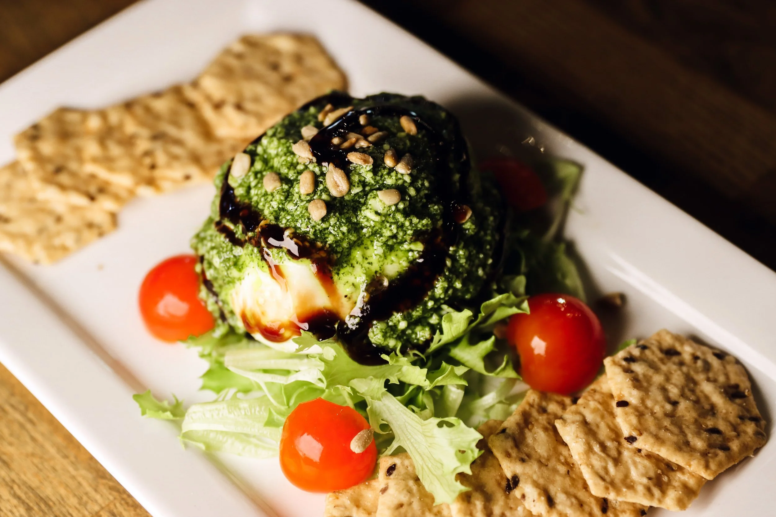 fresh burrata atop mixed greens with cherry tomatoes, sunflower seeds, and basil-parmesan spread, drizzled in balsamic; served with gluten free crackers