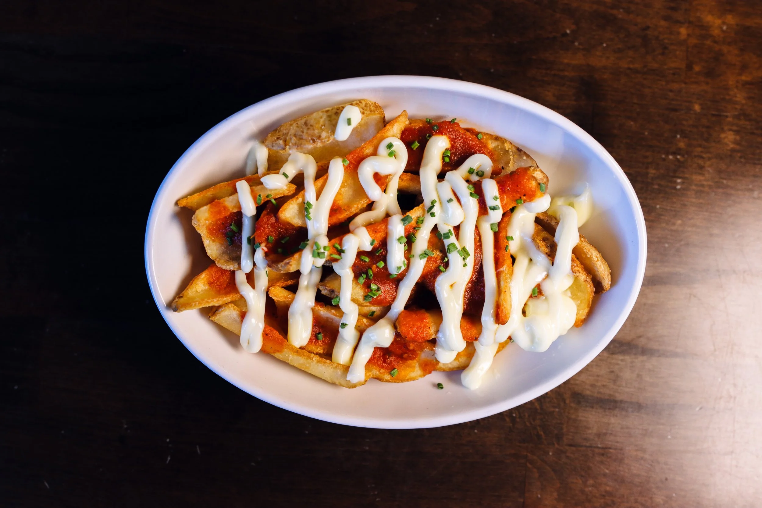 piripi fries with spicy tomato-roasted red pepper sauce & house aioli